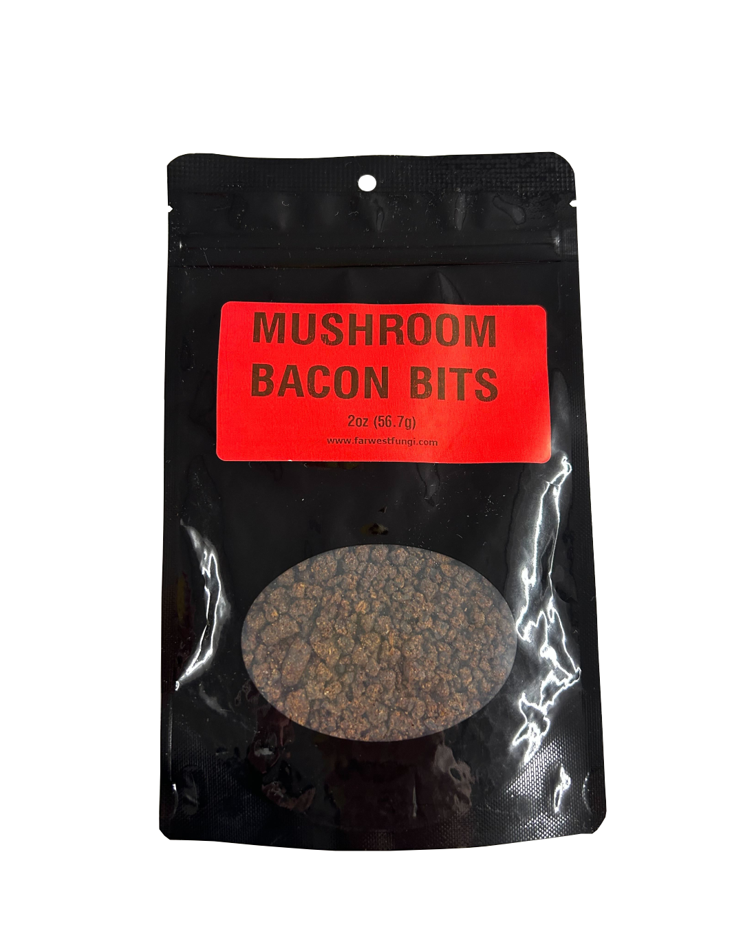 We make our Mushroom Bacon Bits with dried organic tree oyster mushrooms. Made in small batches by hand in the Far West Fungi kitchen, from organic mushrooms grown on our family farm. It has a great meaty texture and just enough peppery spice. With so much flavor, it’s hard to believe it’s so healthy! Great for salad toppings or simply to snack on.