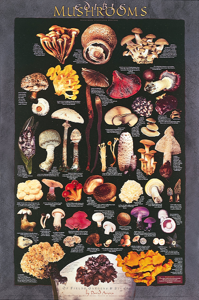 One of a collection of four original posters created from plates by David Arora. This poster depicts numerous popular and commonly cultivated edible mushrooms, some of which are found in backyards and gardens, some of which are farm-grown. Educational descriptions accompany each mushroom photo. High-quality semi-gloss prints with rich colors.