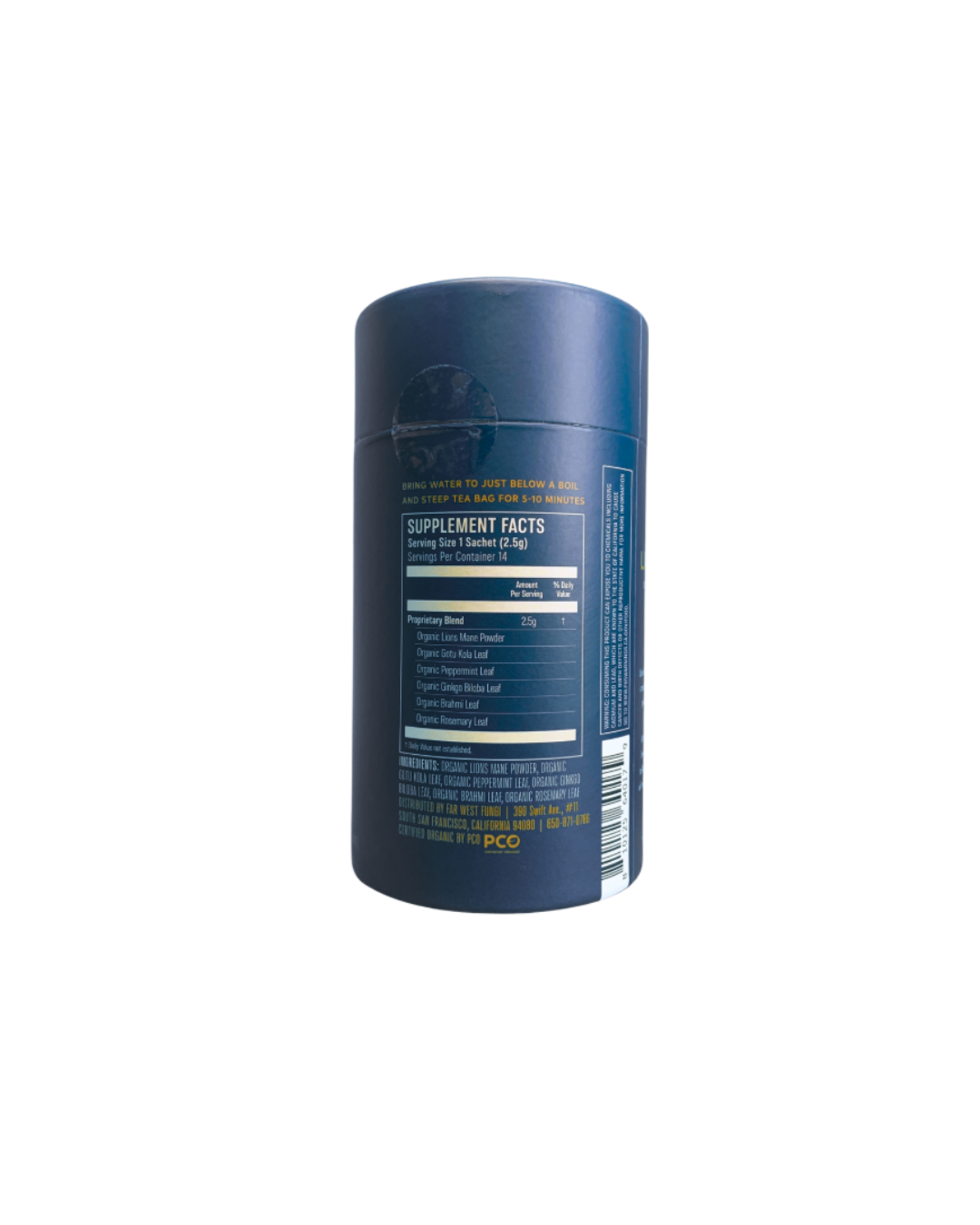 One of the medicinal mushroom powerhouses, Lion's Mane contains bioactive substances that have beneficial effects on the body, especially the brain, heart, and gut. Research is being conducted into their possible effectiveness at combating dementia and Alzheimer's disease, neurological disorders, and even depression and anxiety. Lion's Mane is joined with Got Kola to banish mental fatigue and enhance memory, ginko biloba for blood flow to the brain, and focus-boosting rosemary to create the ultimate Brain Tea. Calming peppermint gives this tea its subtle flavor.
