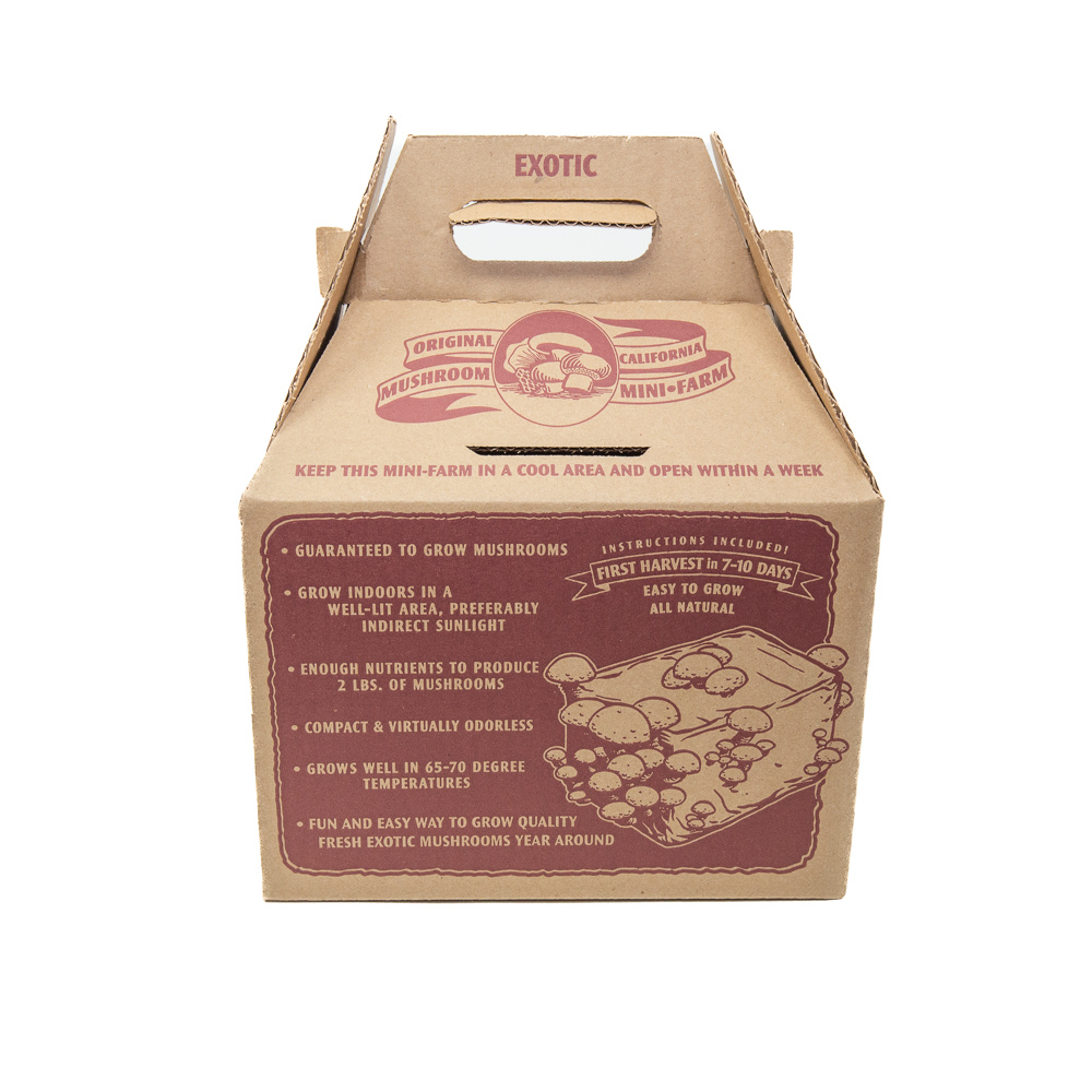 The spectacular Pleurotus ostreatus. Imagine clusters of hundreds of succulent, shellfish-like mushrooms that can reach the size of 18 inches in diameter. This exotic tropical strain of oyster mushrooms produces bright pink fruiting bodies that look more like coral or rose petals than mushrooms. A high iron content gives this mushroom its vivid color and subsequent meaty taste. The flavor is so meaty, in fact, that it can be used as a substitute -- the perfect choice for vegetarians. This mushroom grow kit requires light misting to produce three to four crops over a two-month period. Expect one to two pounds of mushrooms from your Mushroom Mini-Farm Grow Kit with proper care.