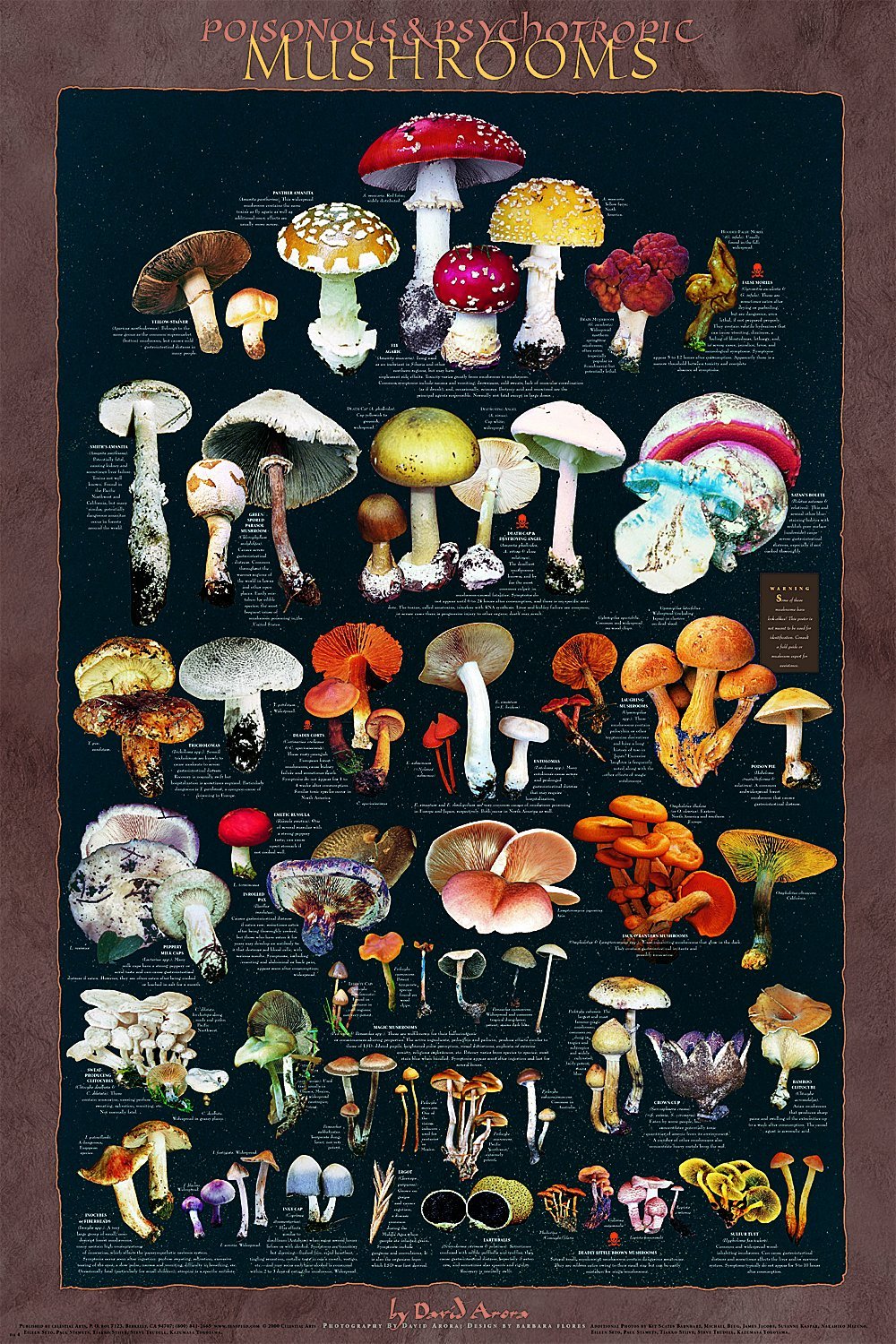 One of a collection of four original posters created from plates by David Arora. This poster depicts numerous poisonous and psychotropic mushrooms from all over the world. A good guide for what not to pick -- DO NOT use this poster as a guide for consumption. This full-color poster shows you what fungi to AVOID. High quality semi-gloss prints with rich colors.