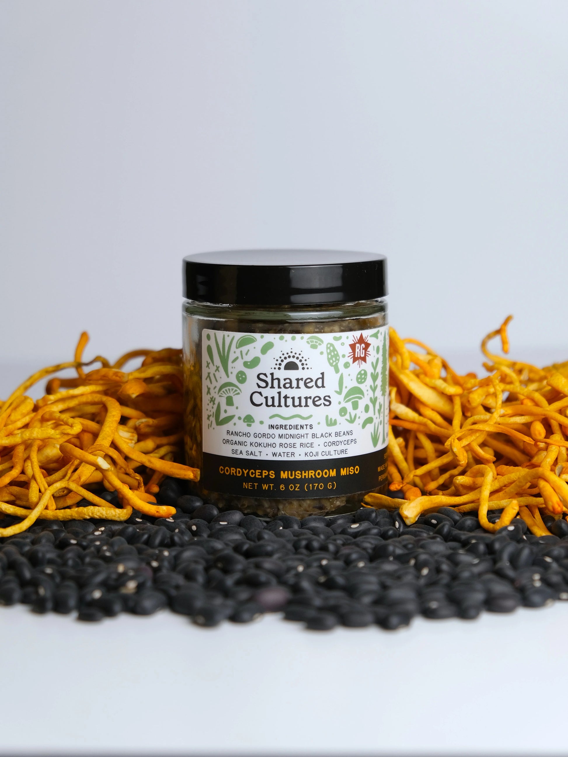 Whole cordyceps are fermented with San Francisco grown koji, organic heirloom rice from Koda Farms, and midnight black beans from Rancho Gordo.